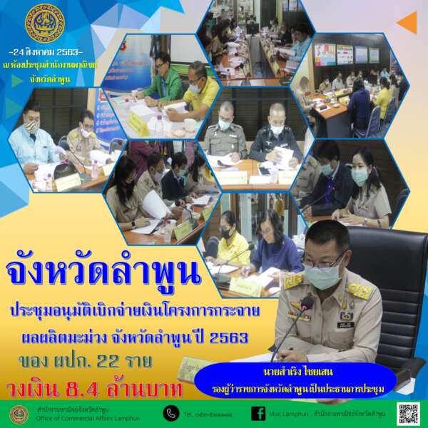จังหวัดลำพูน ประชุมอนุมัติเบิกจ่ายเงินโครงการกระจายผลผลิตมะม่วง จังหวัดลำพูน ปี 2563 ของ ผปก. 22 ราย วงเงิน 8.4 ล้านบาท
