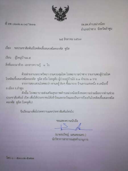 จากการสอบสวนโรคพบว่า ผู้ป่วยรับประทาน หลู้ ดิบๆ ที่ซื้อมาจากร้านขายลาบแห่งหนึ่ง ในเขตตำบลเหมืองจี้ อำเภอเมือง จังหวัดลำพูน ดังนั้นโรงพยาบาลส่งเสริมสุขภาพตำบลม่วงน้อย จึงขอความร่วมมือจากท่านช่วยประชาสัมพันธ์ เปิด เพื่อให้ประชาชนได้เข้าใจและระวังและเป็นการป้องกัน โรคติดเชื้อสะเตรฟโตคอกคัส หรือโรคหูดับ ลงนามโดยนายธนวิชญ์ แสนสองแคว นักวิชาการสาธารณะสุขชำนาญการ