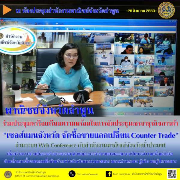 วันพุธที่ 26 สิงหาคม 2563 เวลา 10.00 น. นางนิยดา หมื่นอนันต์ พาณิชย์จังหวัดลำพูน ร่วมประชุมหารือเตรียมความพร้อมในการจัดประชุมเจรจาธุรกิจการค้า “เซลส์แมนจังหวัด จัดซื้อขายแลกเปลี่ยน Counter Trade” ผ่านระบบ Web Conference กับสำนักงานพาณิชย์จังหวัด ณ ห้องประชุมสำนักงานพาณิชย์จังหวัดลำพูน ตำบลเวียงยอง อำเภอเมือง จังหวัดลำพูน โดยมีนายสุชาติ สินรัตน์ รองปลัดกระทรวงพาณิชย์ เป็นประธานการประชุม ซึ่งกระทรวงพาณิชย์ กำหนดจัดกิจกรรมแลกเปลี่ยนซื้อขายสินค้าของจังหวัด ภายใต้นโยบาย “เกษตรผลิต พาณิชย์ตลาด” ตามนโยบาบของรองนายกรัฐมนตรีและรัฐมนตรีว่าการกระทรวงพาณิชย์ (นายจุรินทร์ ลักษณวิศิษฏ์) ภายใต้ชื่องาน “เซลส์แมนจังหวัด จัดซื้อขายแลกเปลี่ยน Counter Trade” ในวันที่ 28 สิงหาคม 2563 ณ ห้องประชุมคอนเวนชั่นเซ็นเตอร์ โรงแรมรามาการ์เด้นส์ กรุงเทพมหานคร โดยมีพาณิชย์จังหวีดมีบทบาทเป็น Saleman จังหวัด ร่วมกับ ภาคเอกชน ผู้ผลิต ผู้ประกอบการในจังหวัด เพื่อสร้างความร่วมมือระหว่างกระทรวงพาณิชย์และกระทรวงเกษตรและสหกรณ์ในการทำงานเพื่อผลักดันขับเคลื่อนการซื้อขายแลกเปลี่ยสินค้าระหว่างจังหวัดของกลุ่มเกษตรกร สหกรณ์การเกษตร ผู้ผลิต และผู้ประกอบการ ในการนี้ สำนักงานพาณิชย์จังหวัดลำพูน ได้นำวิสาหกิจชุมชนกลุ่มแม่บ้านริมร่อง และกลุ่มวิสาหกิจชุมชนพัฒนาผลิตภัณฑ์พืชผักสมุนไพรและผลไม้ เข้าร่วมเจรจา MOU กับองค์การตลาดเพื่อเกษตรกร ซึ่งคาดว่าจะมีมูลค่าซื้อขายไม่น้อยกว่า 30 ล้านบาท
