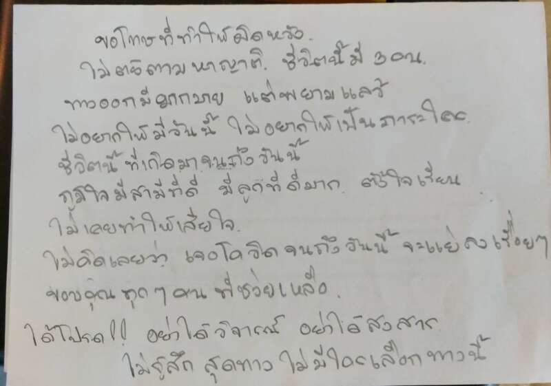 เปิดจดหมายลาตายภรรยาพ่อค้าส้มตำรมควันฆ่าตัวตายยกครอบครัว สุดเศร้า ระบุขอโทษที่ทำให้ผิดหวัง ไม่อยากเป็นภาระใคร ภูมิใจที่มีสามีที่ดี ลุกชายเป็นเด็กดี พร้อมสั่งเสียไม่ต้องตามหาญาติ